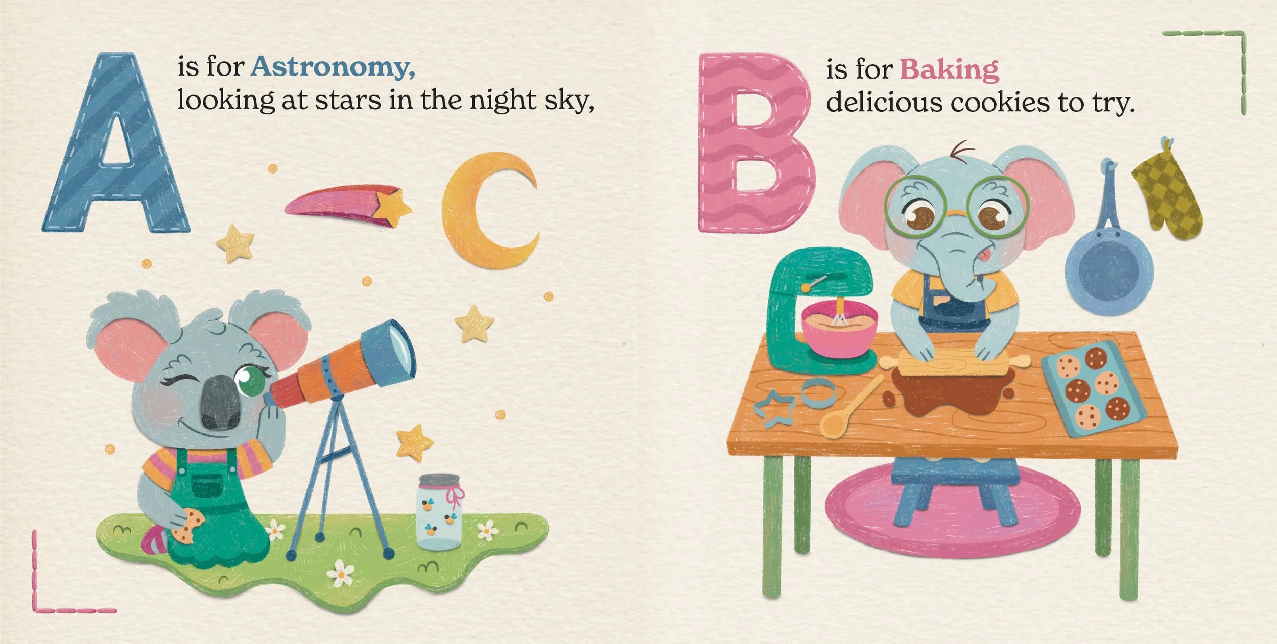 The ABCs of Cozy Hobbies written by me In this rhyming story, animals do activities from knitting a scarf to catching butterflies, and everything in between. Find a new hobby idea of your own! These creative critters are exploring all kinds of cozy hobbies from A to Z! BACK TO BOOKS